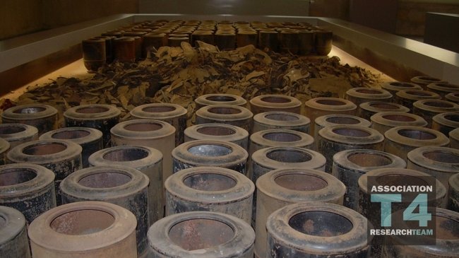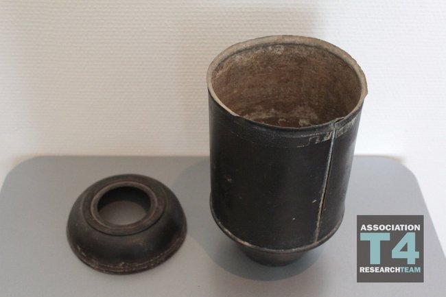 This original standard ash capsule for remains of the cremated body. This metal capsule could be put into a cinerary urn. These type of capsules were used on large scale in T4 Euthanasia centers and concentration camps. Sometimes a piece of fire clay with a number on was used for identyifying the remains of the dead body after burning.