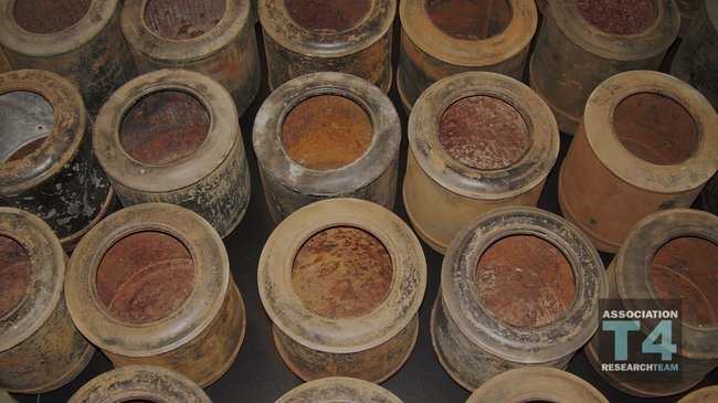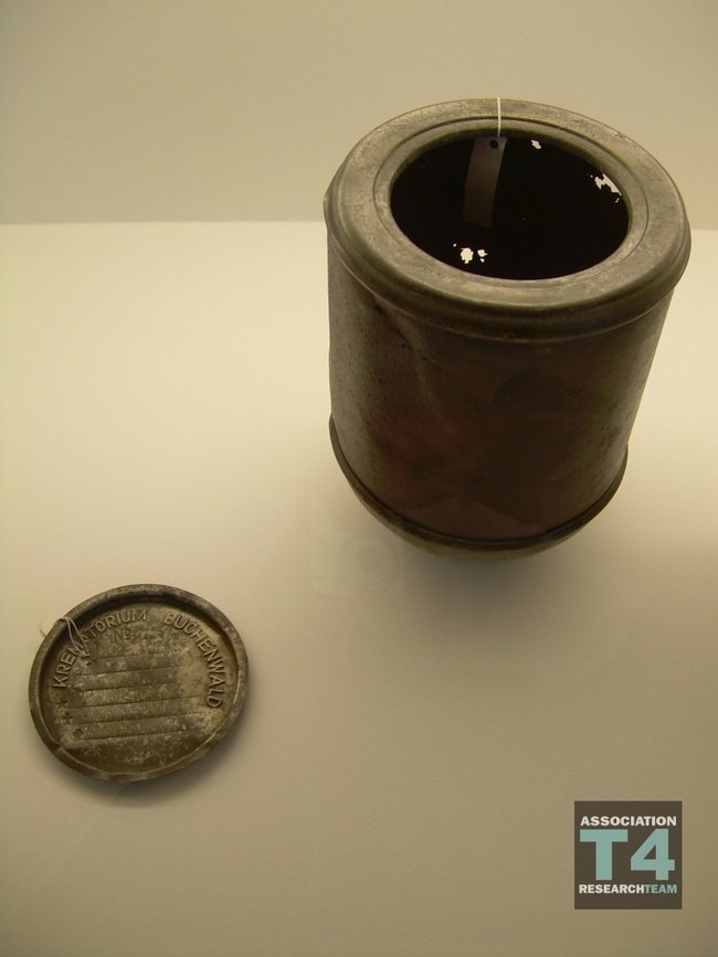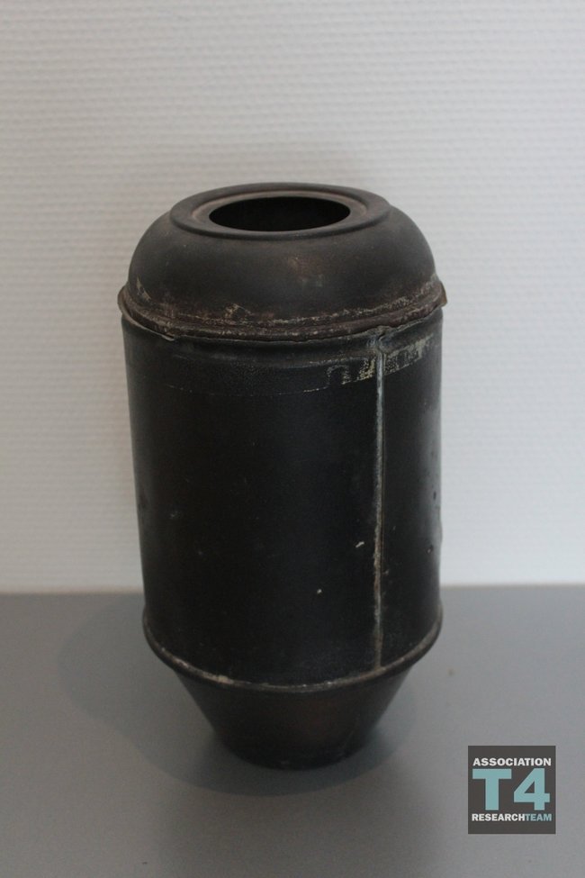 This original standard ash capsule for remains of the cremated body. This metal capsule could be put into a cinerary urn. These type of capsules were used on large scale in T4 Euthanasia centers and concentration camps. Sometimes a piece of fire clay with a number on was used for identyifying the remains of the dead body after burning.